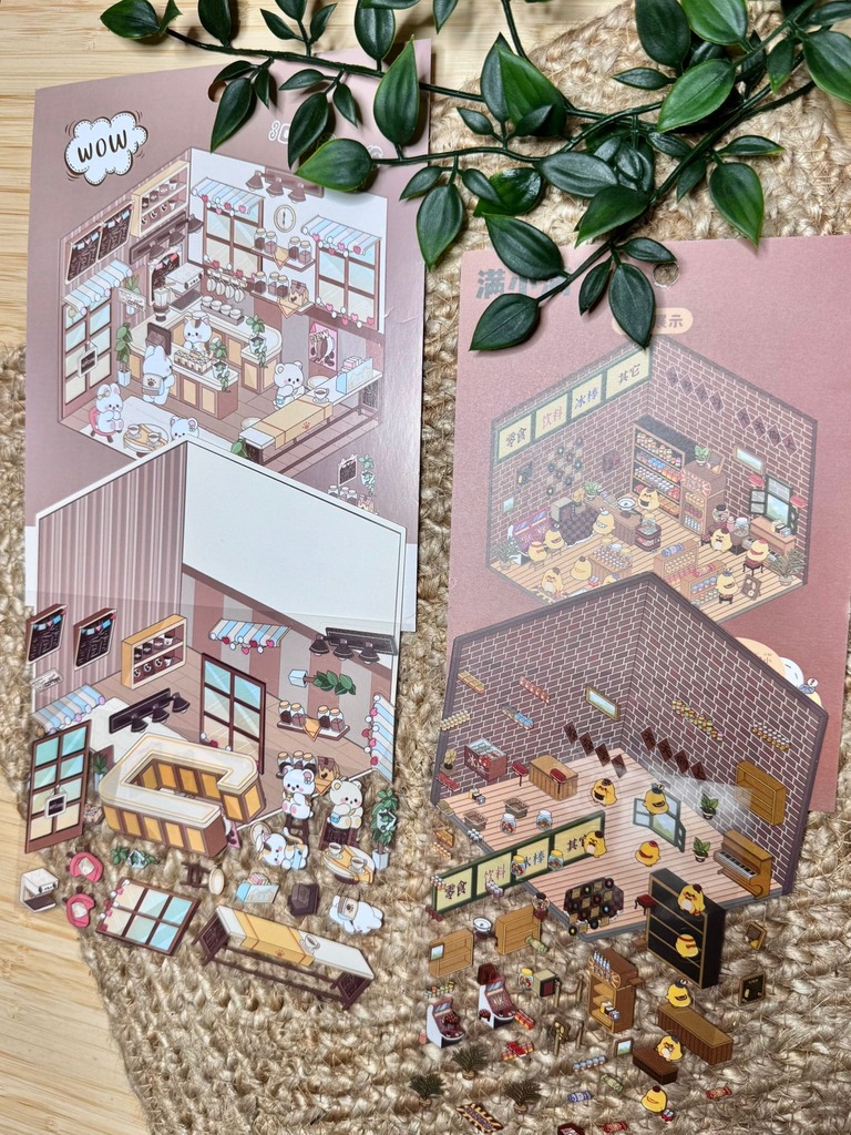 Trabajarás con láminas impresas que incluyen paredes, suelos, mobiliario, estanterías, mostradores, ventanales, personajes y mini accesorios, como los que ves en las imágenes. A través del montaje por capas descubrirás cómo generar profundidad, perspectiva para que la composición cobre vida.