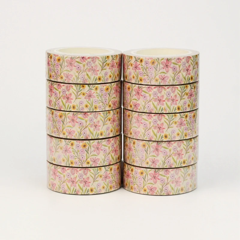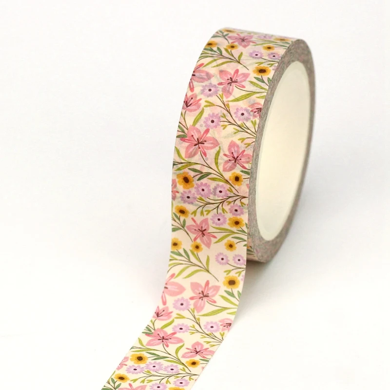 Washi tape con estampado de ramas de flores en colores rosa, amarillo y malva.