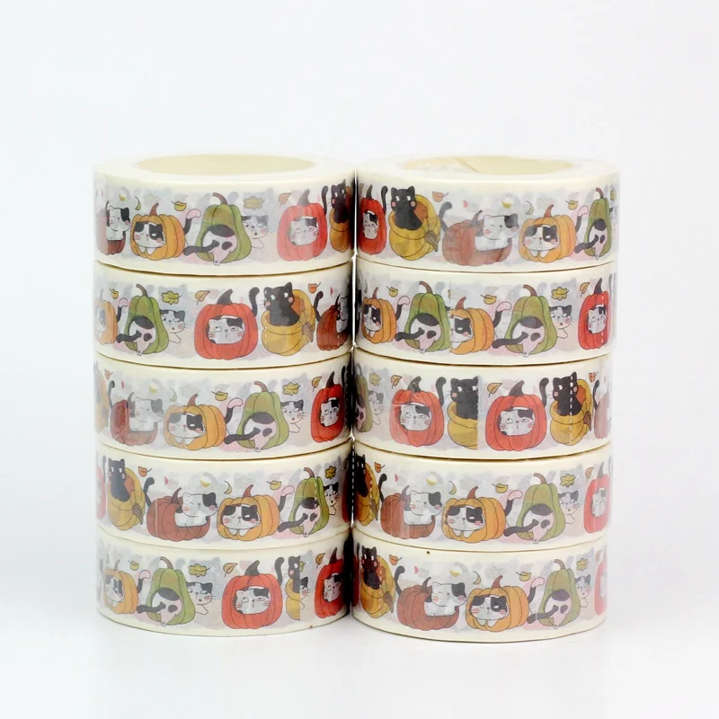 Este washi tape otoñal está lleno de encanto felino: calabazas de todas las formas y colores —naranjas, verdes, marrones y amarillas— con grandes agujeros por donde se cuelan simpáticos gatitos.